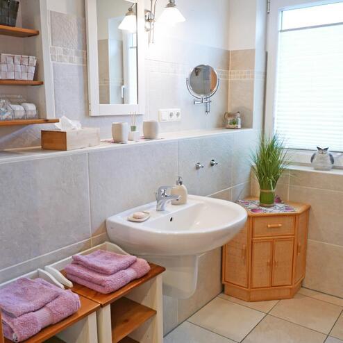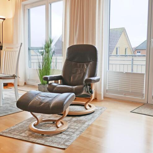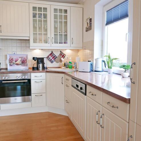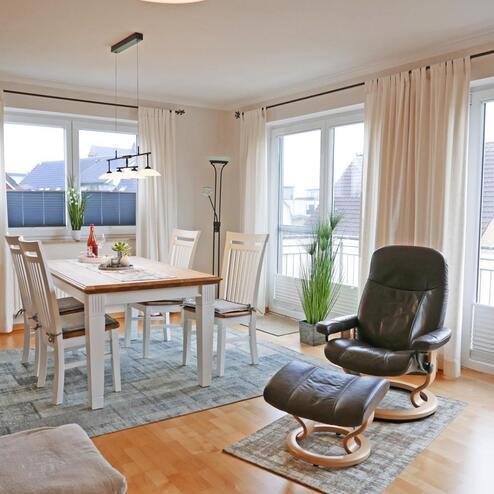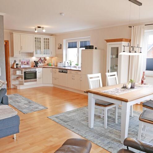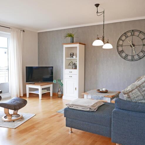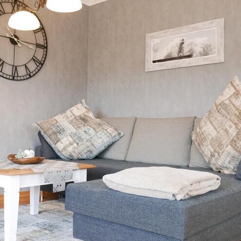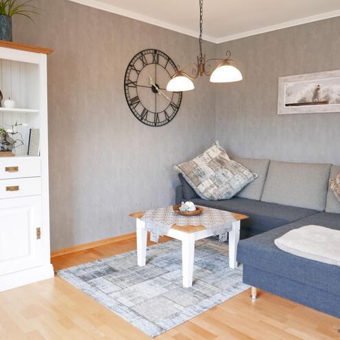 Der geräumige Wohnbereich stellt den Mittelpunkt unserer schönen Ferienwohnung dar und erwartet Sie mit einer gemütlichen Couchgarnitur. Machen Sie es sich hier in trauter Zweisamkeit bequem und lassen Sie einen ereignisreichen Tag zwischen Schlei und Ostsee bei einem leckeren Wein ausklingen. Auch an regnerischen Tagen bieten Flachbild-TV, Stereoanlage und kostenfreies WLAN mediale Unterhaltung, eine kleine Büchersammlung lädt zum Schmökern ein!
