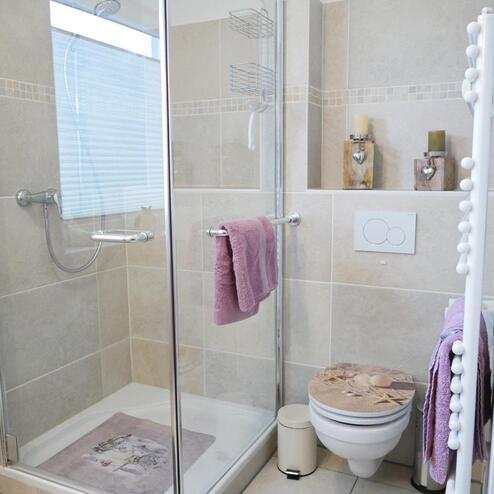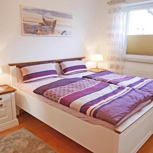 Für die angenehme Nachtruhe steht Ihnen ein Schlafzimmer mit 180x200cm großem Doppelbett zur Verfügung. Das Bad wurde ebenfalls sehr hell und modern eingerichtet und mit einer großen Dusche ausgestattet.