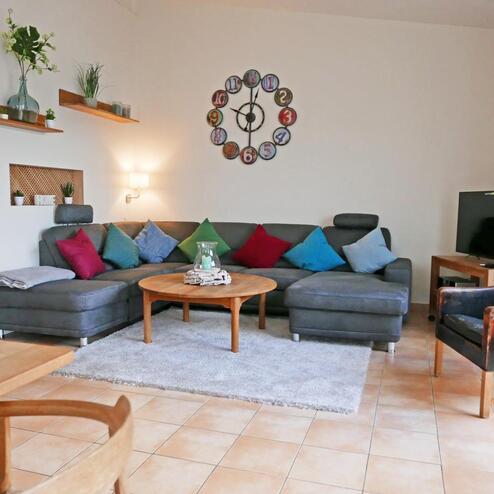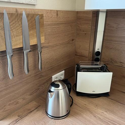 Schon beim Betreten der Wohnung empfängt Sie ein Gefühl des 'Angekommensein', welches sich auch beim weiteren Begehen weiter fortführt. Im lichtdurchfluteten Wohnbereich wartet schon der erste Blickfang mit der großen, bunten Uhr an der Wand auf Sie, die mit weiteren farbenfrohen Accessoires im Wohnbereich geschmackvoll kombiniert wurde. Anschließend befindet sich auch die moderne Landhausküche, die umfangreich mit diversen Kochutensilien ausgestattet wurde. Bereiten Sie hier für sich und Ihren Liebsten leckere Mahlzeiten zu, die Sie dann entweder am massiven Designer-Esstisch oder direkt auf dem 'Sonnenseiten-Balkon' mit gemütlicher Sitzgarnitur verspeisen können. Von hier aus lassen sich laue Sommerabende auch toll bei einem Gläschen Wein genießen... lassen Sie den Alltag einfach mal wieder hinter sich! Für die wohlverdiente Nachtruhe nach einem ereignisreichen Tag in Kappeln erwartet unsere Urlaubsgäste ein liebevoll eingerichtetes Schlafzimmer mit großem Doppelbett. Um frisch in den Tag zu starten steht Ihnen ein helles Vollbad mit Fenster zur Verfügung!